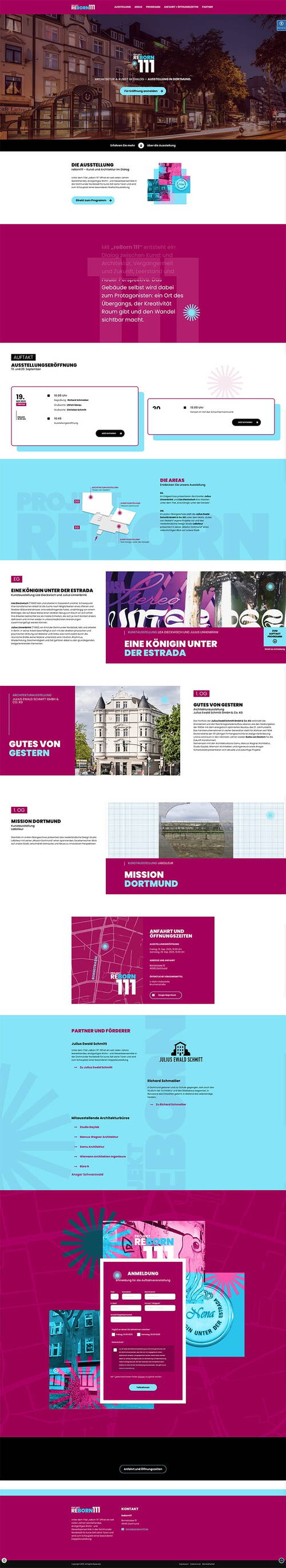 Die Website für reBorn 111 präsentiert ein außergewöhnliches Projekt in der Dortmunder Nordstadt. Mit frischen Farben und einem zeitgemäßen Erscheinungsbild setzt der Onepager alles daran, Besucher für die Ausstellung zu begeistern.
